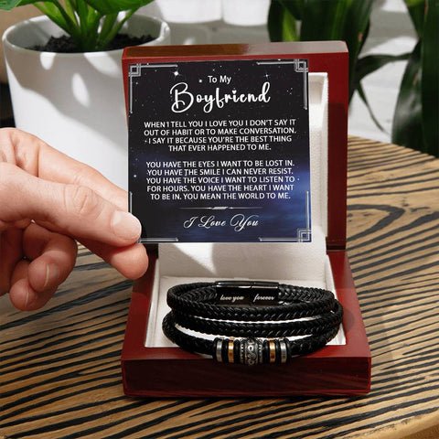 This personalized men’s bracelet expresses heartfelt love and meaning. It’s perfect for giving to your boyfriend or special someone on their birthday, Valentine’s Day, Christmas, or anniversary, and makes beautiful keepsake jewelry. Show him your unending love with this one-of-a-kind gift!